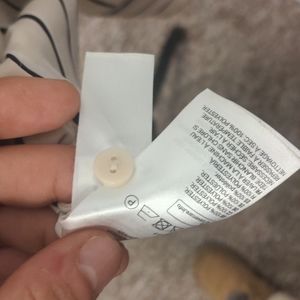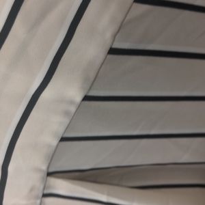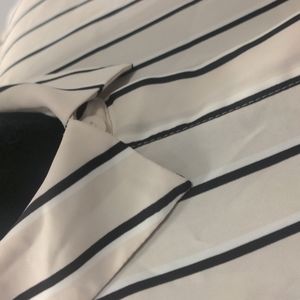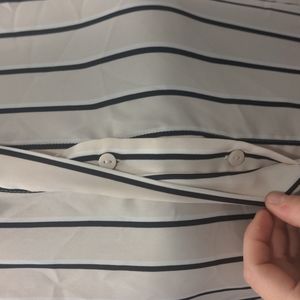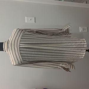 Beautiful blouse by H&M. It is creme color with black and white stripes. It is button down and all buttons are hidden with the exception of the one on the colar. The sleeves also have the buttons. You can wear it rolled up or down. Like new condition. Made in Bangladesh