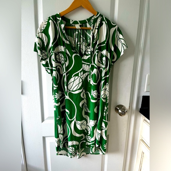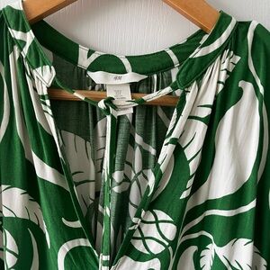Short dress in a viscose weave featuring a round neckline with gathers and an opening with narrow ties at the front. Loose fit with short butterfly sleeves and a rounded hem. Unlined. Size:S