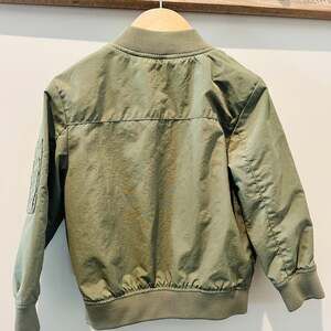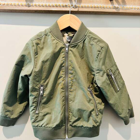 H&M Kids Olive Green Bomber Jacket — a stylish and versatile outerwear piece for children. This jacket features a full zip closure, ribbed collar, cuffs, and hem, and classic bomber jacket pockets, including a utility pocket on the sleeve. Perfect for layering in various seasons, offering a modern and cool look. Excellent pre-owned condition with no noticeable flaws.