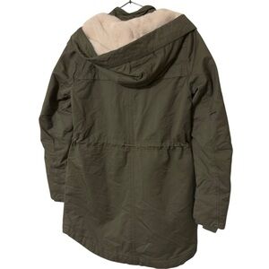 Chic khaki utility jacket. Features a hood and front pockets. Ideal for layering.
