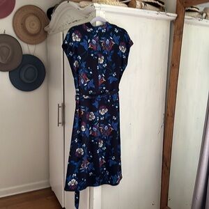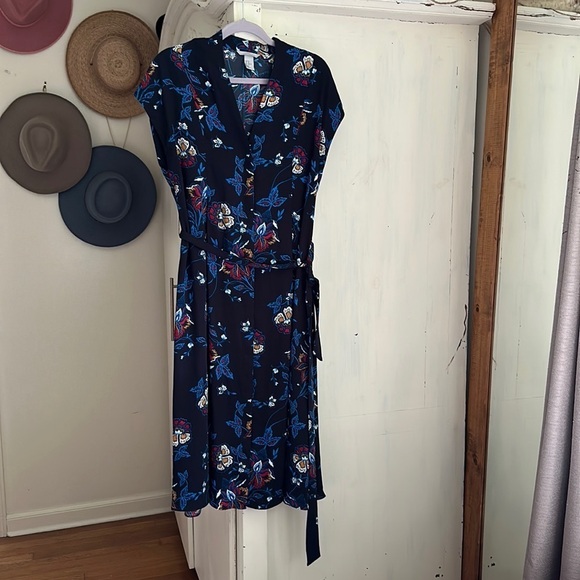 H&M floral navy blue cap sleeve V neck button down midi dress with removable matching belt size 10 Bust 19 Waist 20 Pit 9 Length 45.5