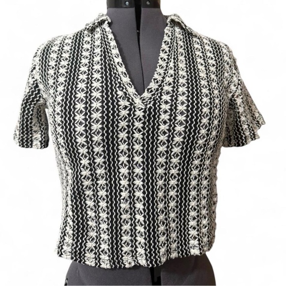 H&M - black & white patterned blouse with short sleeves and V-neckline. - Size: XS - Got it in the Philippines 🇵🇭 #blouse