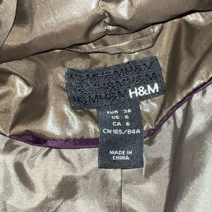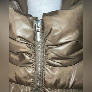 H&M, 6, metallic long sleeve, zip closure, zip fleece lined pockets, cowl collar mid length, clasp built in belt puffer jacket. looks like a bronze /gold color.
