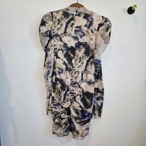 Purple, taupe, green and orange dress from H&M. Fully lined body, unlined arms. Puff shoulders, ruched butt, ruched right front of Dress. Never worn, NWT