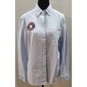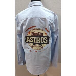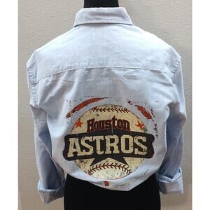 This brand new H&M adult small long sleeve button down 100% cotton shirt has been embellished with a Houston Astros design on the back and an iron on patch on the right chest.