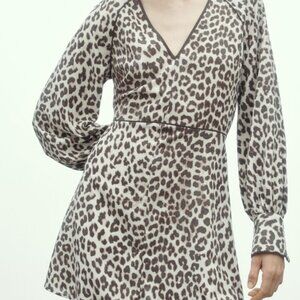 Short dress in woven fabric with a deep V-neckline, long, raglan balloon sleeves with a slit and button at the cuffs, and a flared skirt. Unlined.