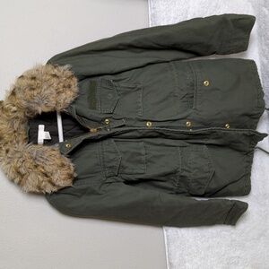 H&M Army Green Coat Faux Fur Collar Womens 0 Olive Green Jacket