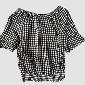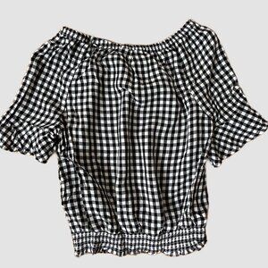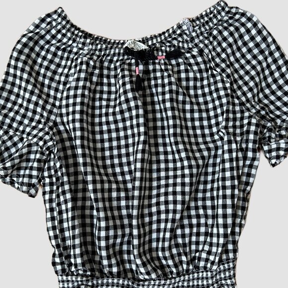 H&M Black & White Girls Checkered Peasant Style Blouse/Top, Elastic Band at Bottom, Size 12-13 year olds, Pre-Owned in Great Condition.