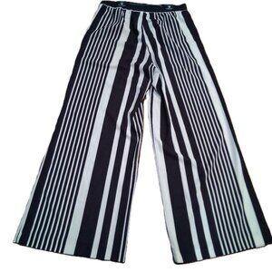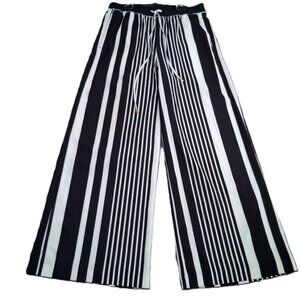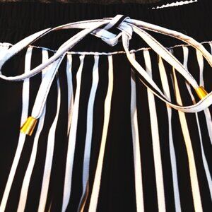 WIDE LEG STRIPED PANTS, BLCK/WHITE. ELASTICIZED WAISTBAND, WITH DRAWSTRING ADORNED W/GOLD HARDWARE. 2 FUNCTIONAL FRONT SIDE POCKETS. 98% POLYESTER, 2% ELASTANE. 28 INCH INSEAM. US WOMEN'S SZ 10. PLEASE NOTE LAST PIC DETAILING FAINT MARKINGS ON BACK OF LEFT PANT LEG, (BARELY NOTICEABLE) GUC.