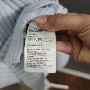 Elevate your wardrobe with this stylish H&M Baby Blue Oversized Ribbed Sweater Vest. Made from a comfortable blend of cotton and acrylic, this cozy vest is perfect for travel, casual or business occasions. The V-neckline and sleeveless design add a touch of sophistication to your outfit, while the solid blue color and oversized fit give you a relaxed and chic look.