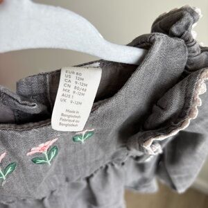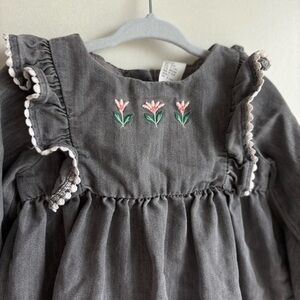 H&M Baby Girls Light Grey Embroidered Flowers Ruffle Long Sleeve Dress 9-12M