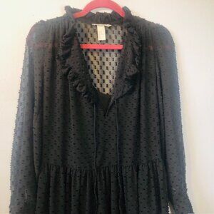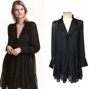 H&M Babydoll Dress SIZE 2 Black Sheer Swiss Dot Ruffle Collar Tie Neck T…