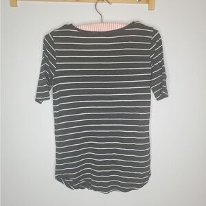 Dark Gray and white striped t shirt. very stretchy soft fabric with a rounded hemline and scoopneck with 3/4 elbow sleeves.