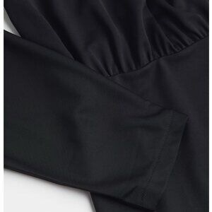 Regretfully parting with one of my most worn work outfits: this black H&M long sleeved dress is professional and a little sexy, while being easy to wear and style. Falls below the knee with a low collar, concealed half-length zipper, and bodice with gathers for added volume and a draped effect. The skirt hits at your true waist and is cut straight with slit at one side. Unlined.