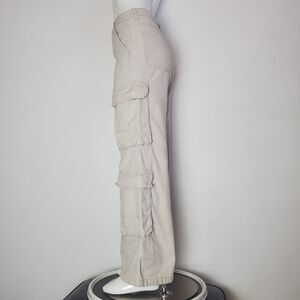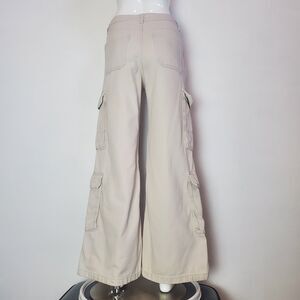 H&M beige denim wide leg cargo pants with zipper fly, 2 hip pockets, 2 back pockets, and 4 large flap cargo pockets.
