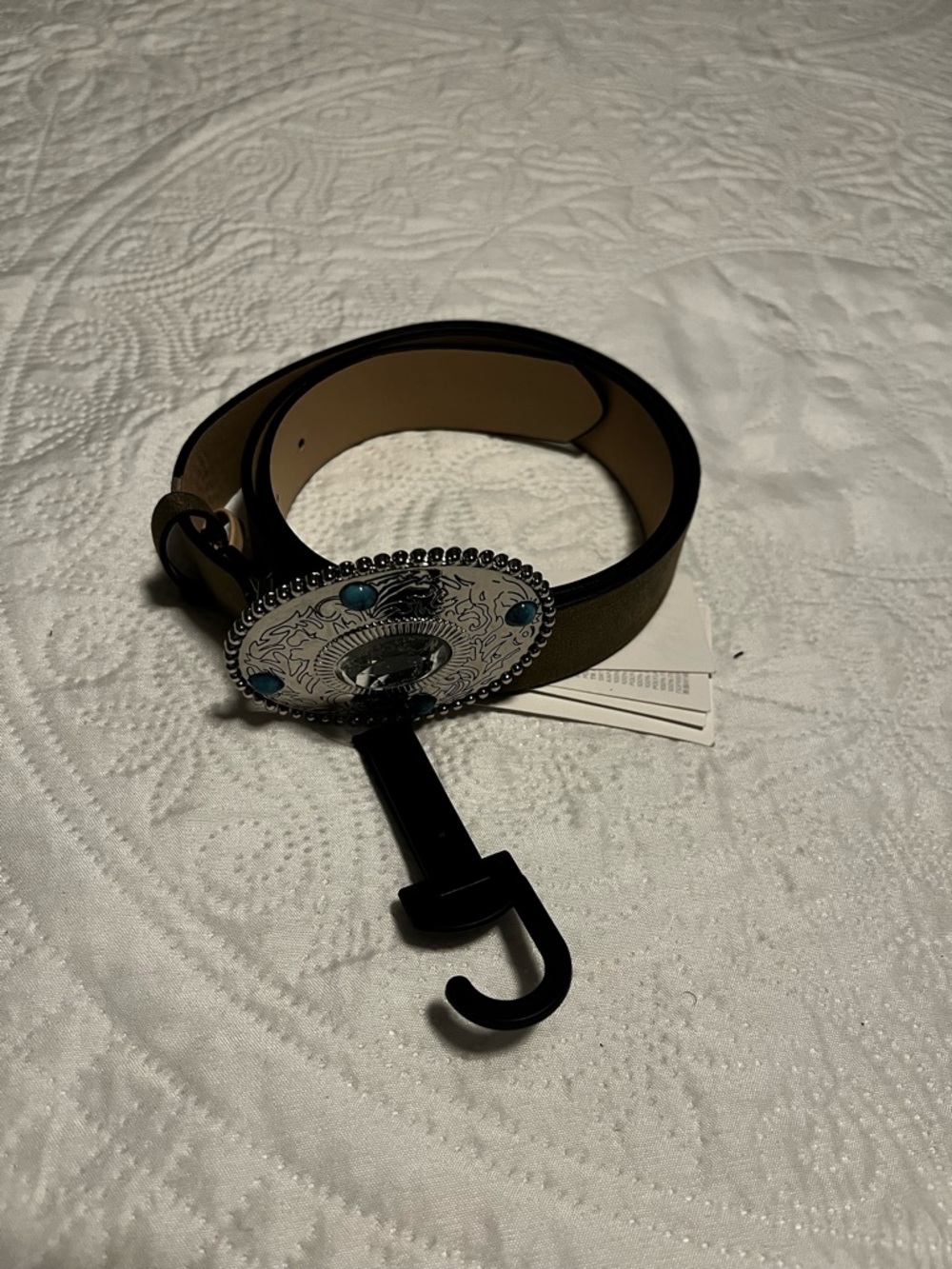 Olive green faux leather belt. Silver western-style concho with turquoise accents. Easy statement accessory. Neutral and versatile.