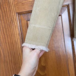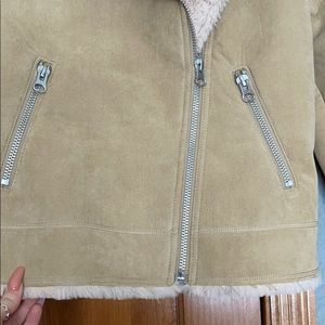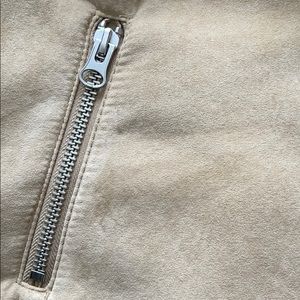 H&M tan faux suede biker jacket; cream colored faux fur lined inside and collar fits true to size; true color accuracy is pictured in the last photo; only worn a few times