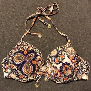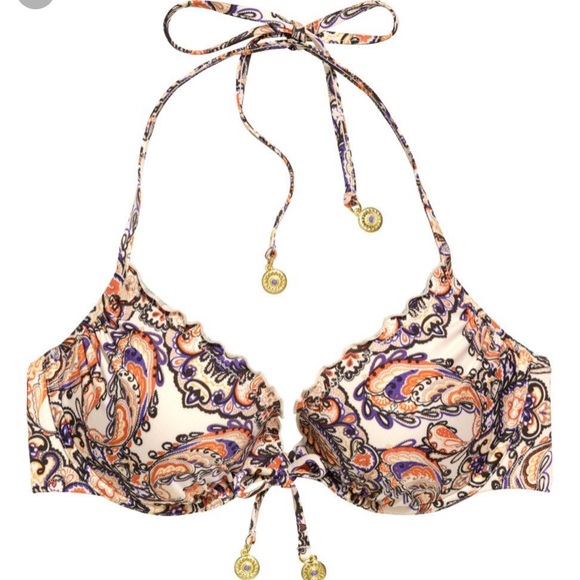 Orange & Purple Paisley Print Push Up Bikini Top With Ruffle Trim, Decorative Bow, and Beaded Neck Ties by H&M