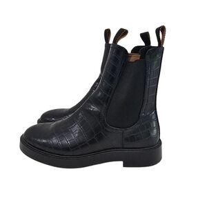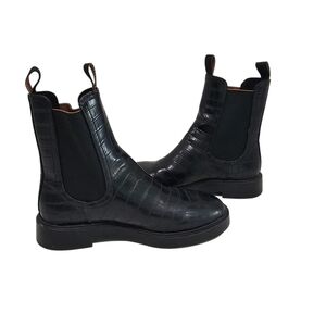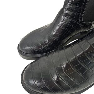 Step up your style game with these H&M black ankle boots, showcasing a bold crocodile texture. The chunky platform sole and elastic side panels ensure a comfortable fit while adding a modern touch. Perfect for making a statement with any outfit.