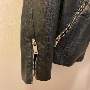 Short, fitted biker jacket. Notched lapels, diagonal zipper at front, and a yoke at back. Front pockets with zipper and a zipper at cuffs. Lined.
