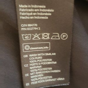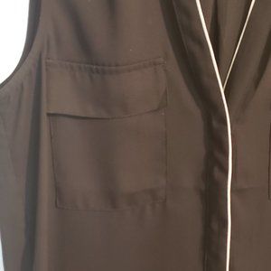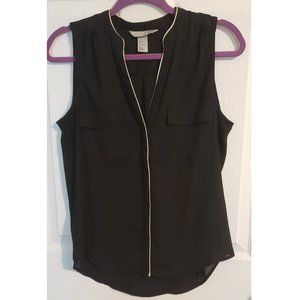 Simple black blouse with white trim from H&M. Perfect for work or casual wear. Hidden buttons down the front. One spare button attached to the tags. The tag says size 8, but this fits much more like a size 6.