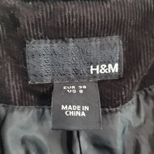 H&M Black Corduroy 2 Button Career Work Office Blazer. Women's size 8. Has pockets with a button closure. Measurements are approximate and are shown in photos. In great preowned condition.