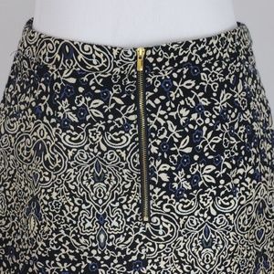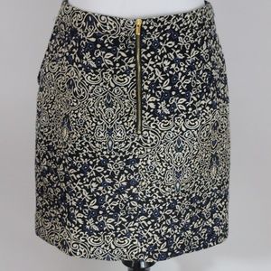 H&M Black, Cream, and Blue Flora Faux Wrap Fully Lined Women's Skirt, Size 8. This stylish and trendy fully-lined skirt has a beautiful black, cream, and blue color hue, floral design pattern, faux angular wrap detail element, and exposed gold zipper closure on the back waistline. The material is 71% Polyester, 28% Cotton, and 1% Elastane. The approximate measurements are as follows: Length = 17", Waist = 30", and Hips = 36".