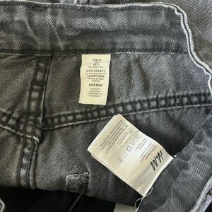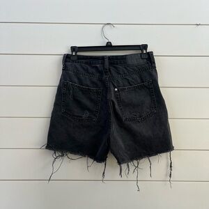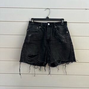 These black jean shorts from H&M feature a heavily distressed design with frayed hems and a high-waisted fit, perfect for adding an edgy touch to your casual wardrobe.