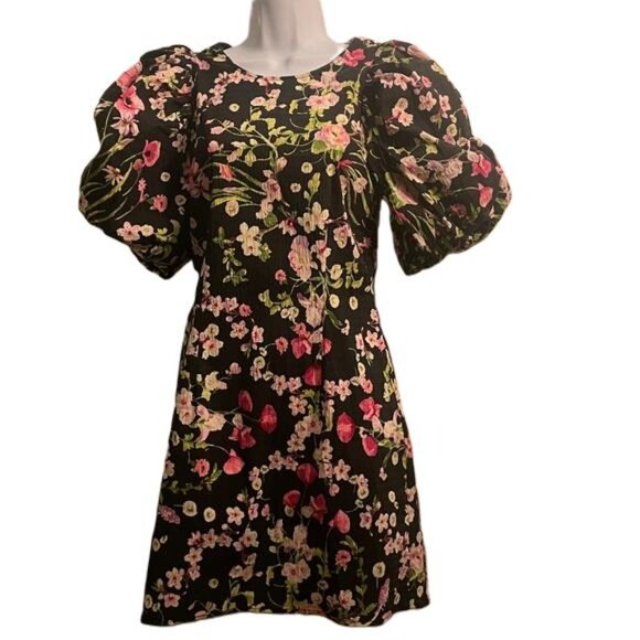 Charming black mini dress adorned with a vibrant floral print. This dress features dramatic puff sleeves and a playful cutout back accented with a delicate bow. Perfect for a garden party or a romantic evening out.