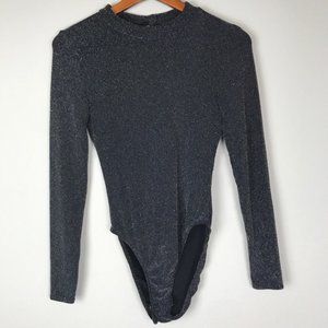 H&M Black Metallic Silver Mock Neck Open Back Long sleeve Bodysuit