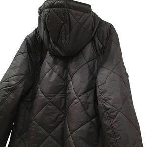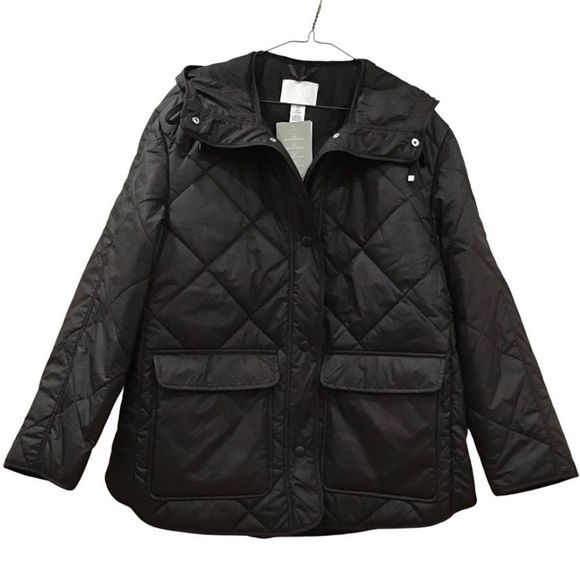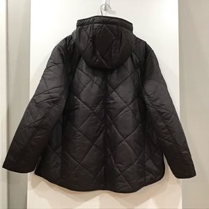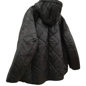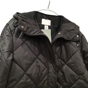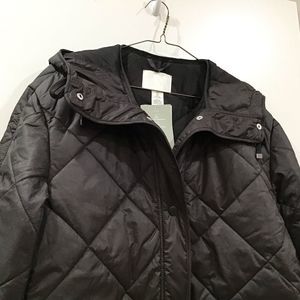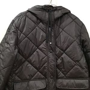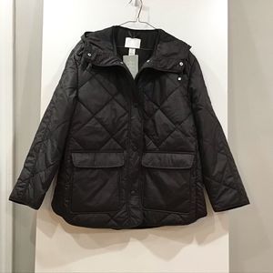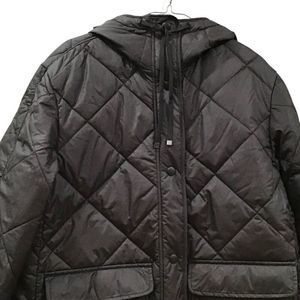 Stylish black quilted puffer jacket. Features a hood and front pockets. Perfect for cold weather. NO TAGS! Worn couple times. In very good condition