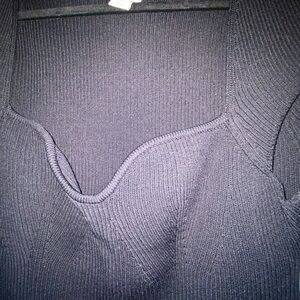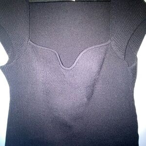 Elegant black ribbed sweater. Features a unique neckline. Perfect for any occasion.