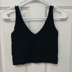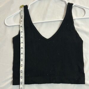 Elevate your style with this chic black ribbed V-neck top. Perfect for any occasion, this versatile piece is a must-have in your wardrobe. Pit to pit 12 inches. There are no tags on the inside. Was originally bought at H&M.