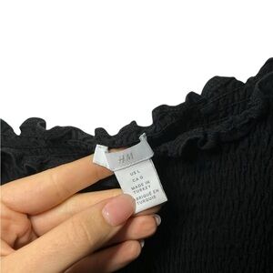 This chic black tank top from H&M features a stylish smocked bodice and a playful ruffled hem. The tie front detail adds a touch of elegance, making it a versatile piece for any occasion. Its sleeveless design ensures comfort and ease of movement.