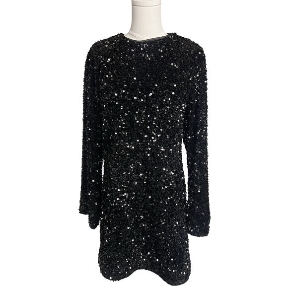 Stunning black mini dress. Covered in shimmering sequins. Long sleeves. Perfect for a night out.
