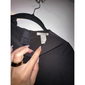 H&M black sheath dress with short sleeves and stylish button details at the waist. Features a flattering silhouette perfect for both work and casual settings. The dress has a convenient back zipper closure. This versatile piece is a great staple for any wardrobe.