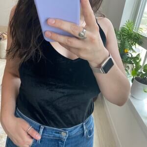 H&M Black Velvet Strappy Bodysuit Size Medium. Excellent condition, like new. Solid black. Crushed velvet material. Strappy low cut back. Fitted. Snap closure at crotch.