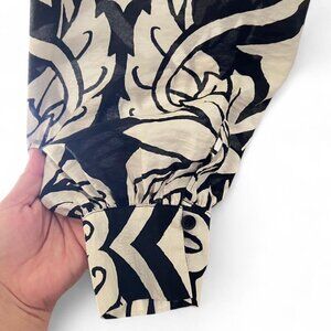 This H&M long-sleeved dress features a bold black and white abstract floral print on lightweight viscose-polyamide fabric. Tagged Medium but fits like a Large, with a relaxed silhouette and standout V-neckline. The flowy tunic style and graphic pattern evoke boho and artsy aesthetics, ideal for casual wear, layering, or transitional seasons. A standout piece for expressive prints and modern comfort—perfect for gallery strolls, brunch, or street-style flair.