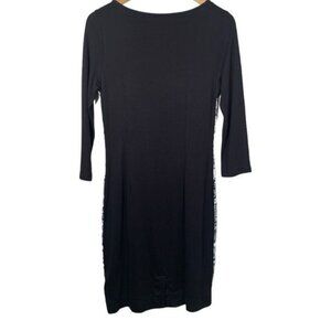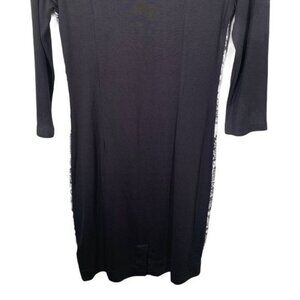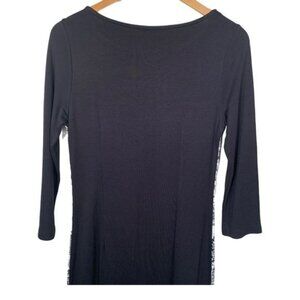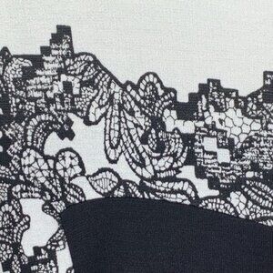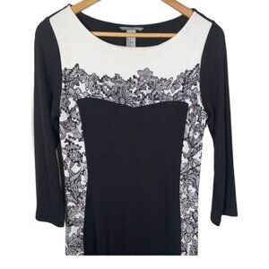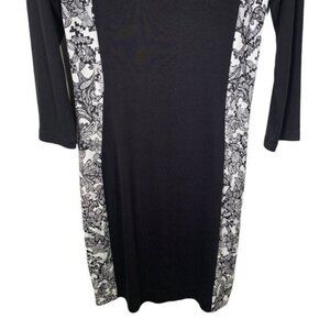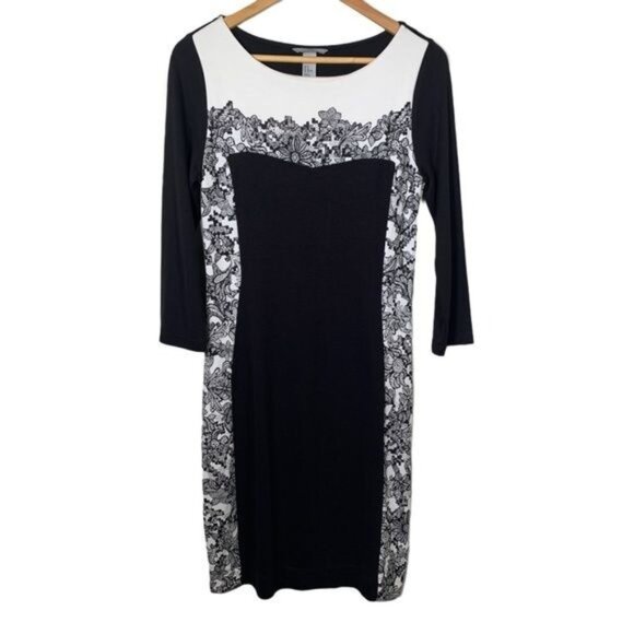 Classic and flattering, this H&M sheath dress features a chic black-and-white colorblock design with a subtle floral lace print. The stretch fabric and 3/4 sleeves make it ideal for work or evening outings. Preowned in great condition with minimal wear.