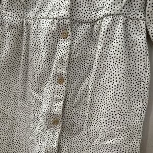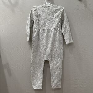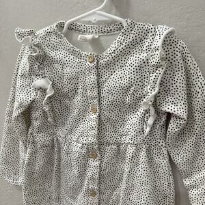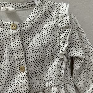 H&M long sleeve romper size 3T. Thick white fabric with black polka dots with ruffles along bodice and buttons down front. Super cute and so soft & cozy! Very good condition.