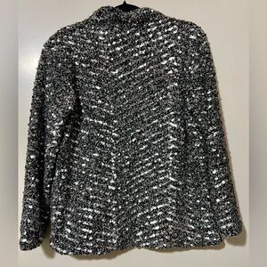 Shimmering black and silver cardigan sweater jacket. Perfect for adding sparkle to any outfit. Ideal for evening wear.