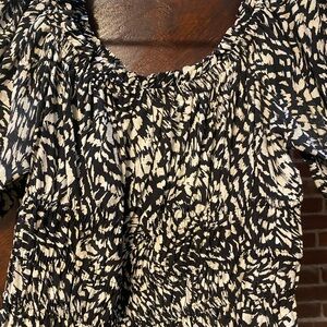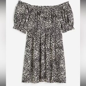 Short, off-the-shoulder dress in a woven viscose blend. Elasticized smocking below bust and at waist, short puff sleeves, and narrow, ruffle-trimmed elastic at upper edge and at cuffs. Unlined. In excellent condition, worn once.