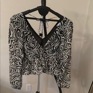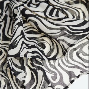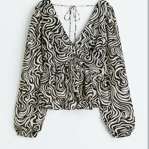 This elegant blouse from H&M features a striking black and white pattern with long puff sleeves and a ruched tie front. The light, flowy fabric and fitted waist silhouette make it a stylish choice for any occasion.