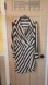 Stylish black and white striped midi dress. Features a wrap design and long sleeves. Perfect for any occasion.