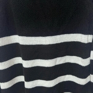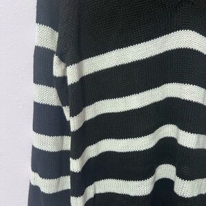 PREOWNED H&M V-neck sweater features a striking black base with bold white stripes, creating a chic and modern look. The medium-weight knit ensures warmth and comfort, making it a perfect choice for cooler days. Its elegant design is ideal for both casual and formal occasions.