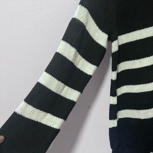 PREOWNED H&M V-neck sweater features a striking black base with bold white stripes, creating a chic and modern look. The medium-weight knit ensures warmth and comfort, making it a perfect choice for cooler days. Its elegant design is ideal for both casual and formal occasions.