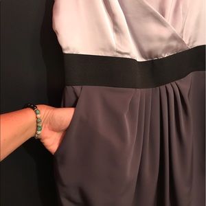 Grey block color sleeveless dress with black elastic empire waist band and pockets