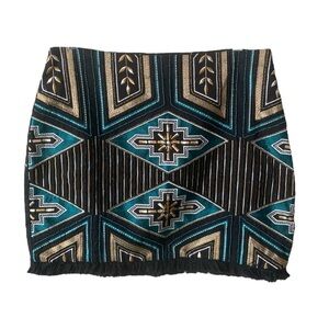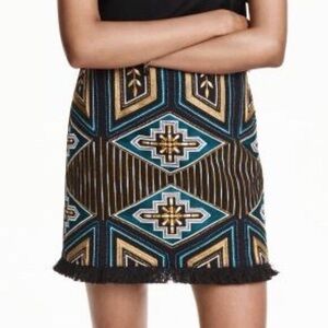 H&M Bloggers favorite Embroidered Beaded Fringe Mini Skirt Sz 10 Geometric Boho