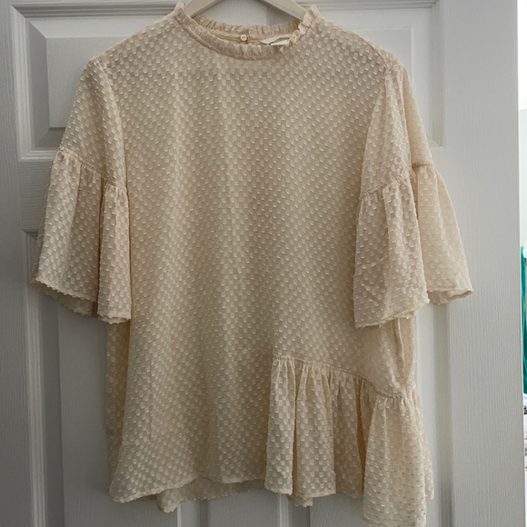 Cream polyester blouse that’s a bohemian flowy look with puff bell sleeves. NWOT