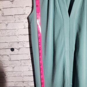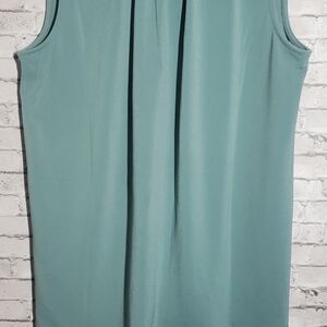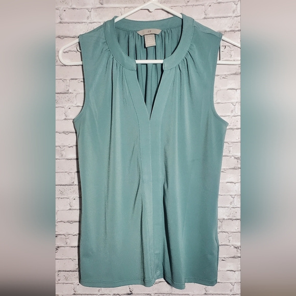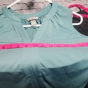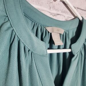 H&M XS blouse. I would say it is a sea foam green. Sleeveless, making it perfect for the summer weather.